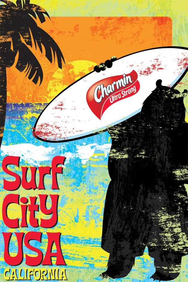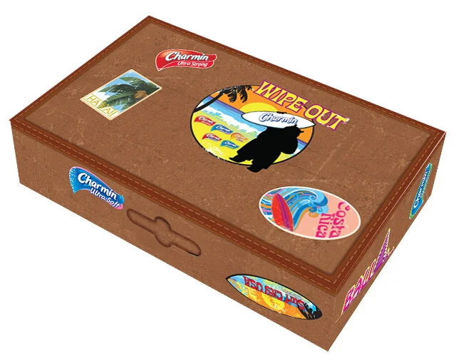 To get the Charmin Sales Team excited about the newest innovations I created the theme Wipe Out around the world. I designed and illustrated two postcards for two of the Charmin brands in different styles. To finish off the kit I created a "Leather" suitcase with travel stickers placed on it.